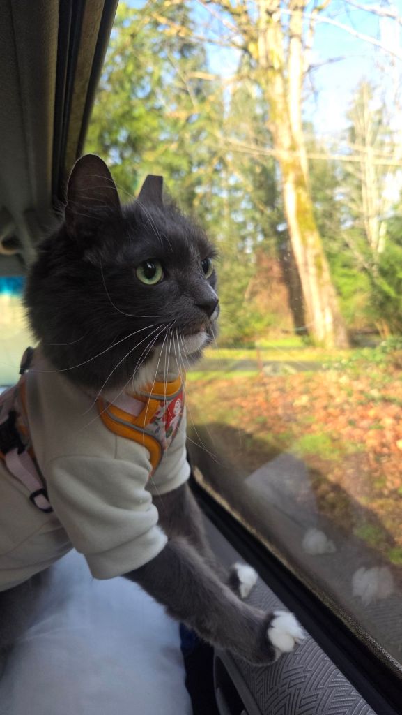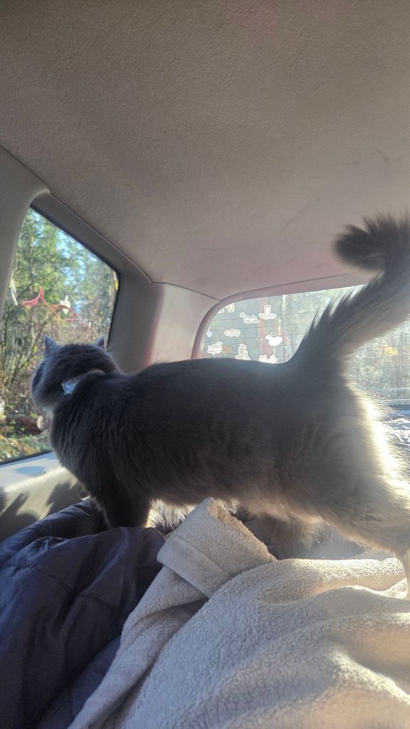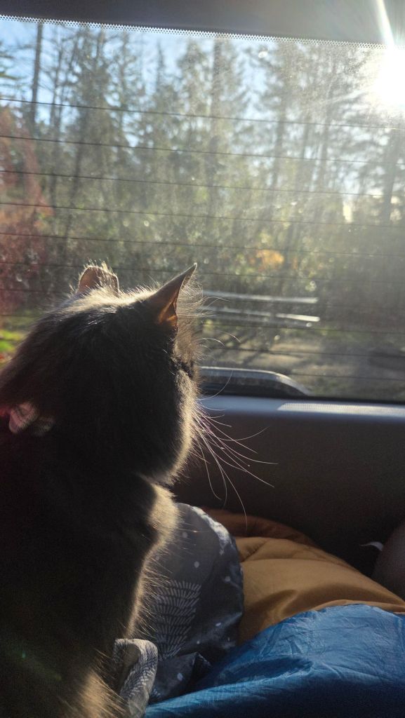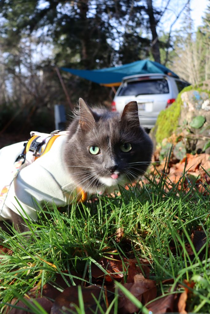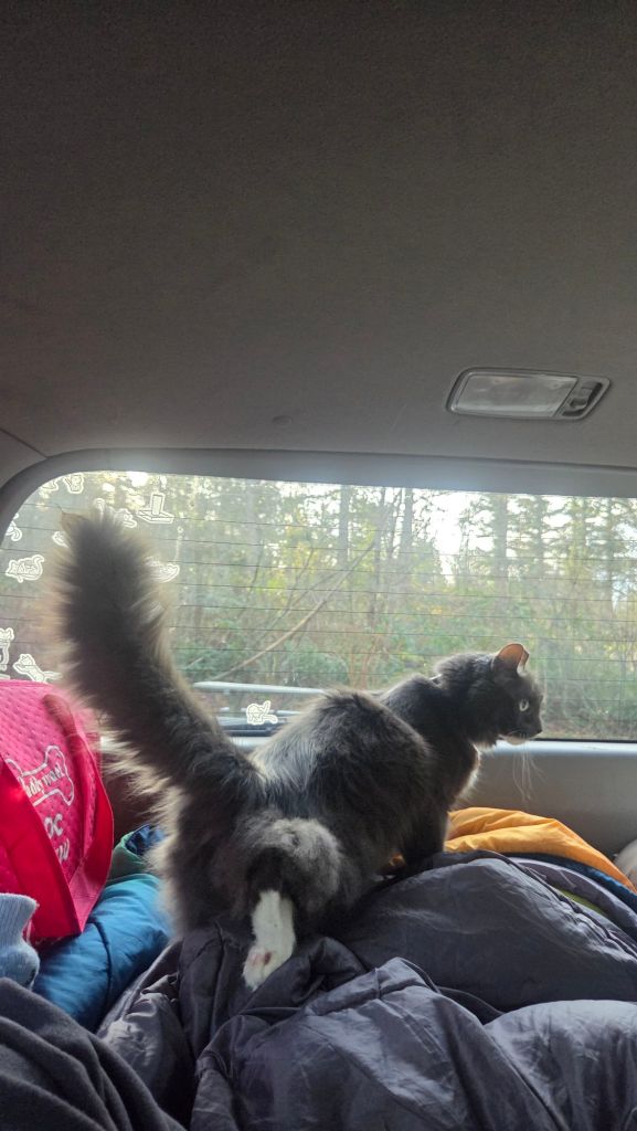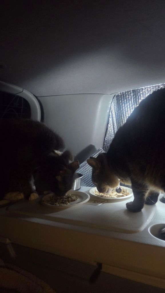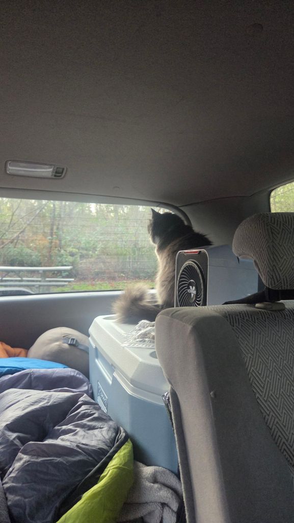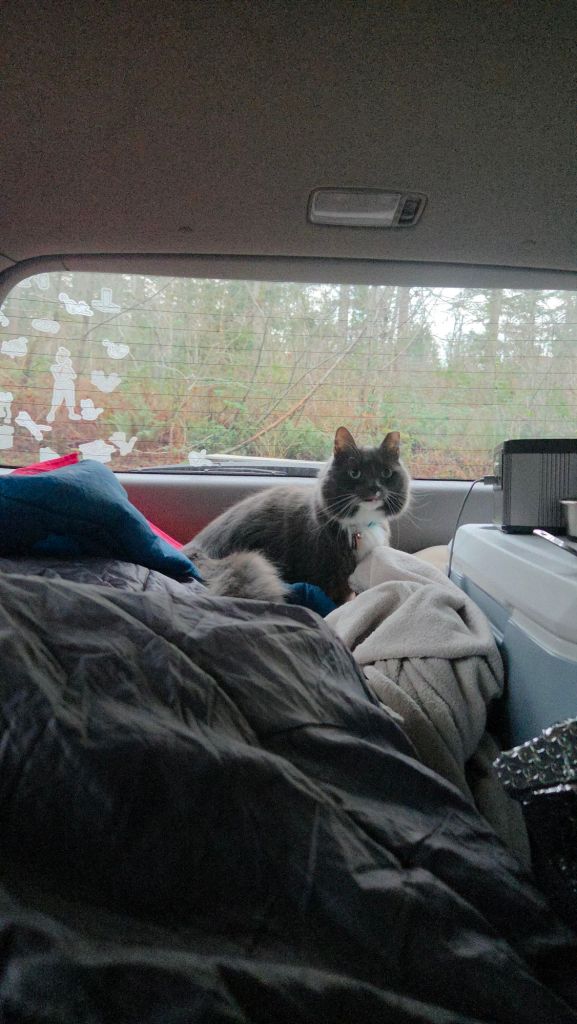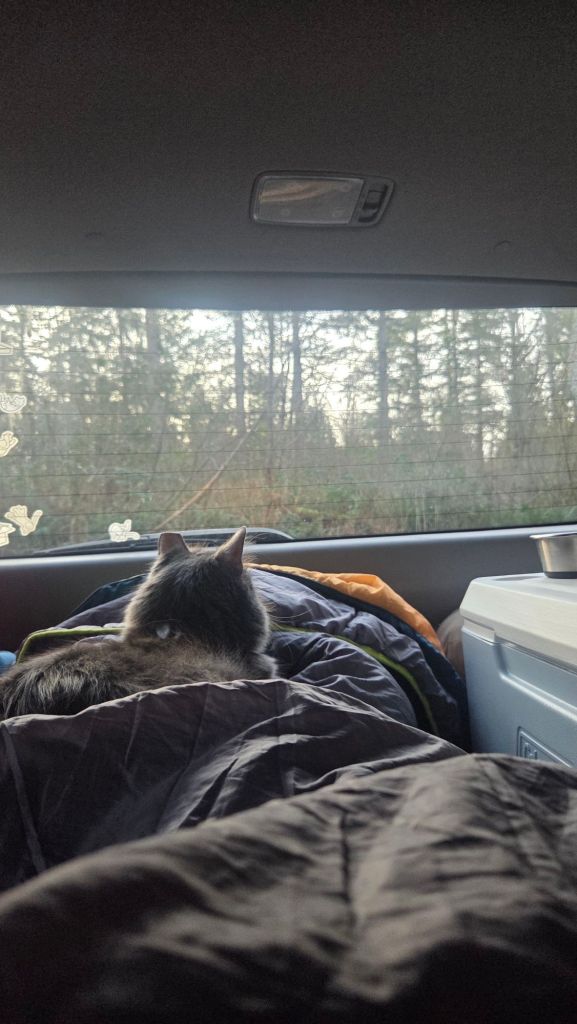 After a bit, I noticed that Sieh seemed to be actively watching something, so I sat up to take a peek out the back window, and it was the other campground cat! They were going to all of the spots that the kids had been walking around yesterday, with special focus paid where Sieh had been eating grass. They eventually wandered out of sight, but it was cool getting to have seen them.