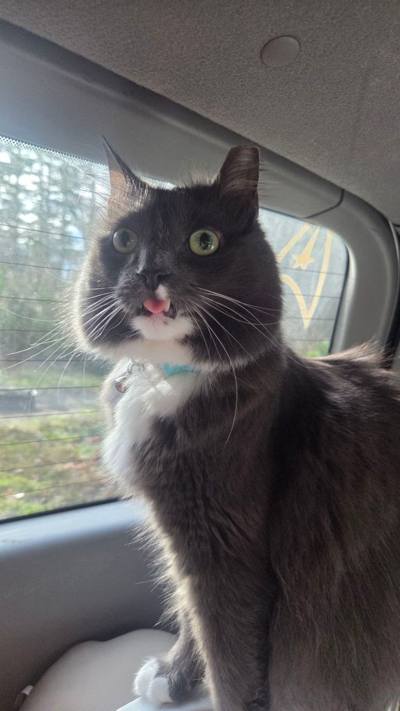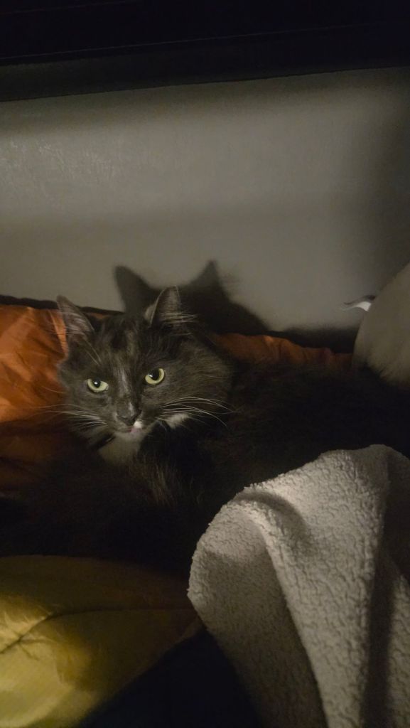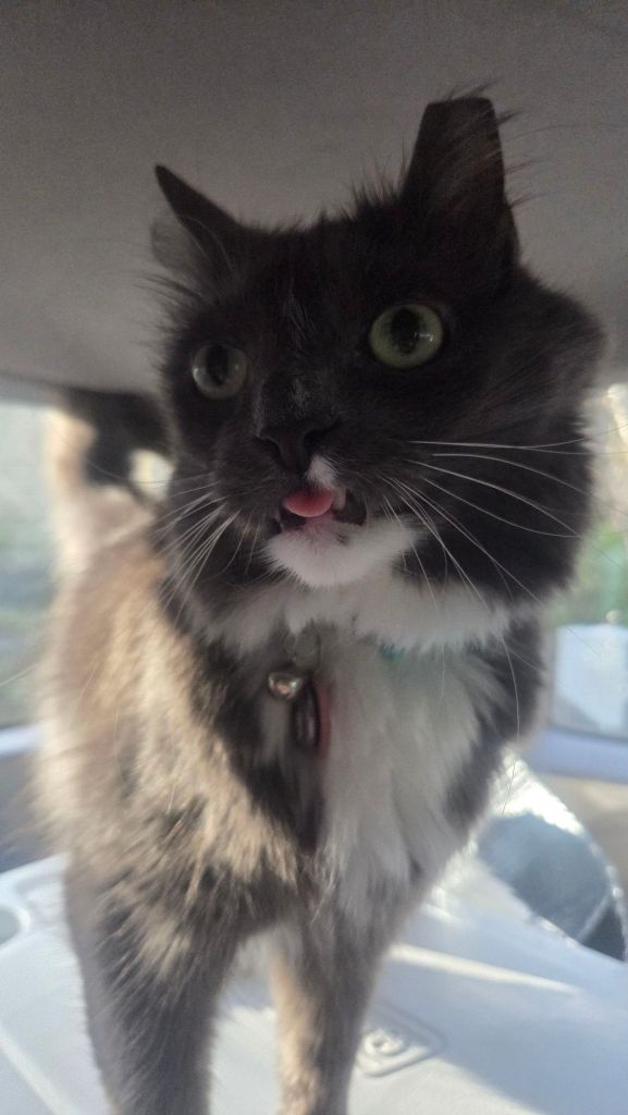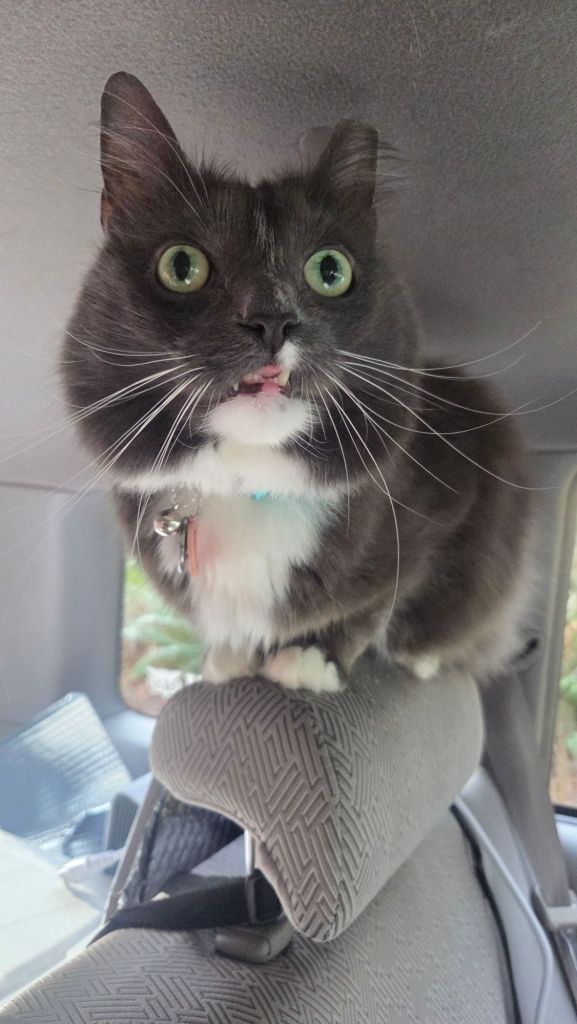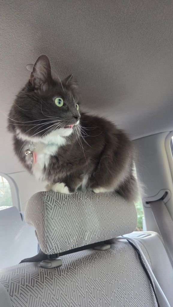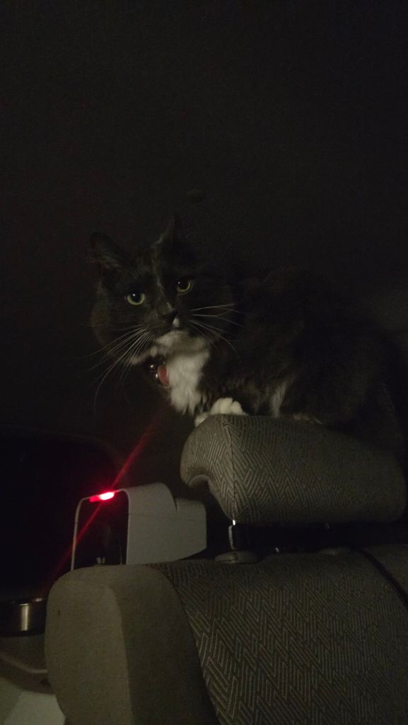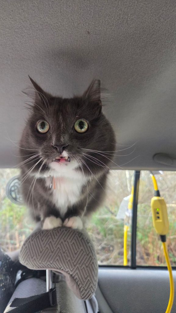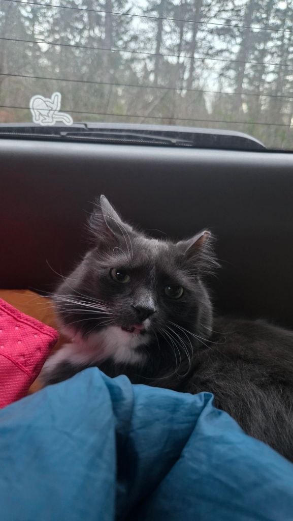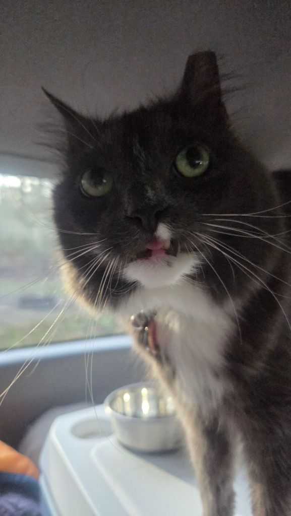 After a bit, I noticed that Sieh seemed to be actively watching something, so I sat up to take a peek out the back window, and it was the other campground cat! They were going to all of the spots that the kids had been walking around yesterday, with special focus paid where Sieh had been eating grass. They eventually wandered out of sight, but it was cool getting to have seen them.