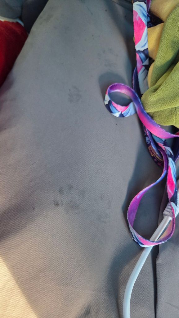 About half an hour later, the other side came loose. Sigh. Got out and just tied it down to the side mirror, because there really wasn’t anything else to secure it to. It wasn’t SUPPOSED to rain overnight, but I’d sleep better if I wasn’t worrying about water getting in the window or soaking my poor rollator (that has to hangout outside due to lack of space inside.)