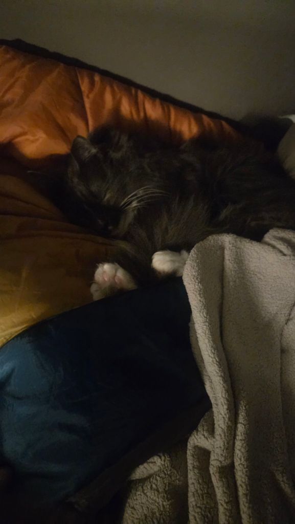 Woke up this morning to Leeloo climbing onto my chest and shoulder to warm up. Apparently the pod was a bit cold so she had a little shiver going on. She warmed up pretty quickly, though, and we had a nice snuggle. Sieh was…directly in front of the space heater again, lol.