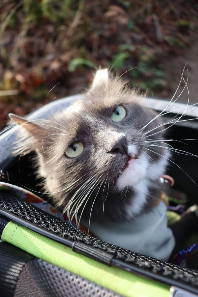 Leeloo likes to ride on top of the backpack, but I have to make sure I hold tight to the leash because she falls off easily. Most of the time her balance issues aren’t that noticeable, but for feats like this her cerebellar hypoplasia becomes very apparent!