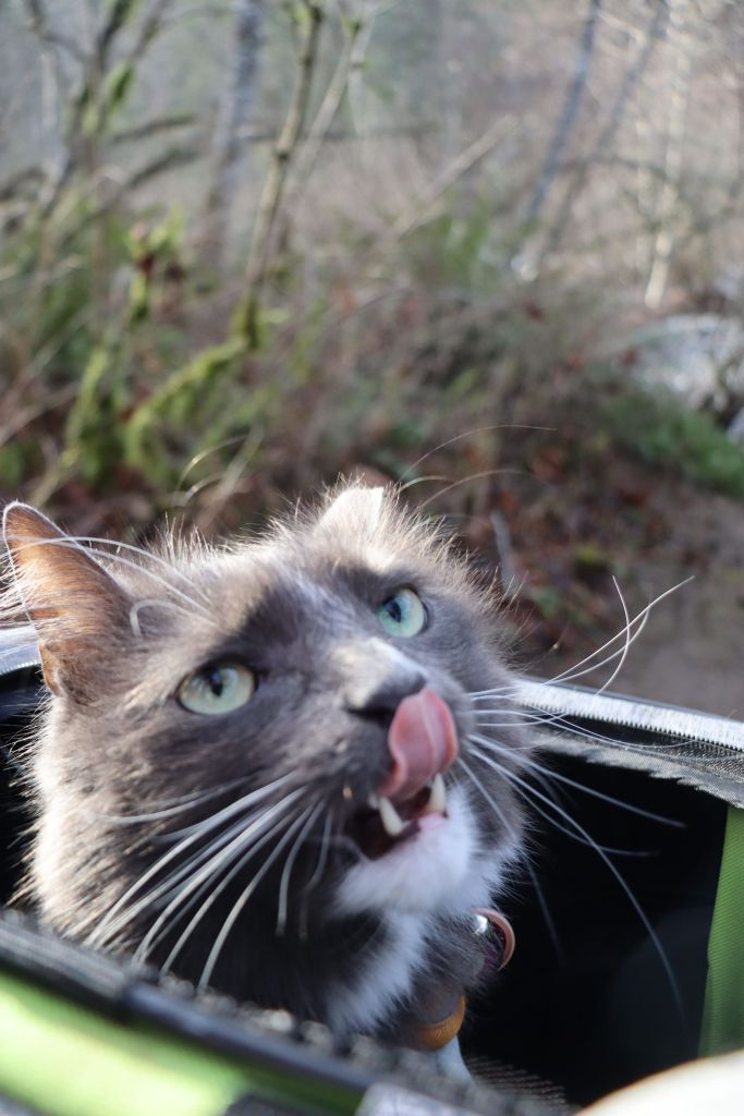 Around 1pm, I got Sieh ready to explore the campsite. He got so excited when I got his harness out! Once he was warmly dressed, we headed outside…but the train was going by again, and apparently Sieh is not a fan of the rail sounds. We went back inside Majel to wait for it to pass, then tried again.