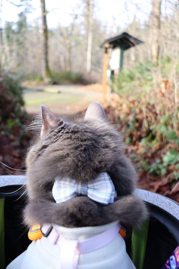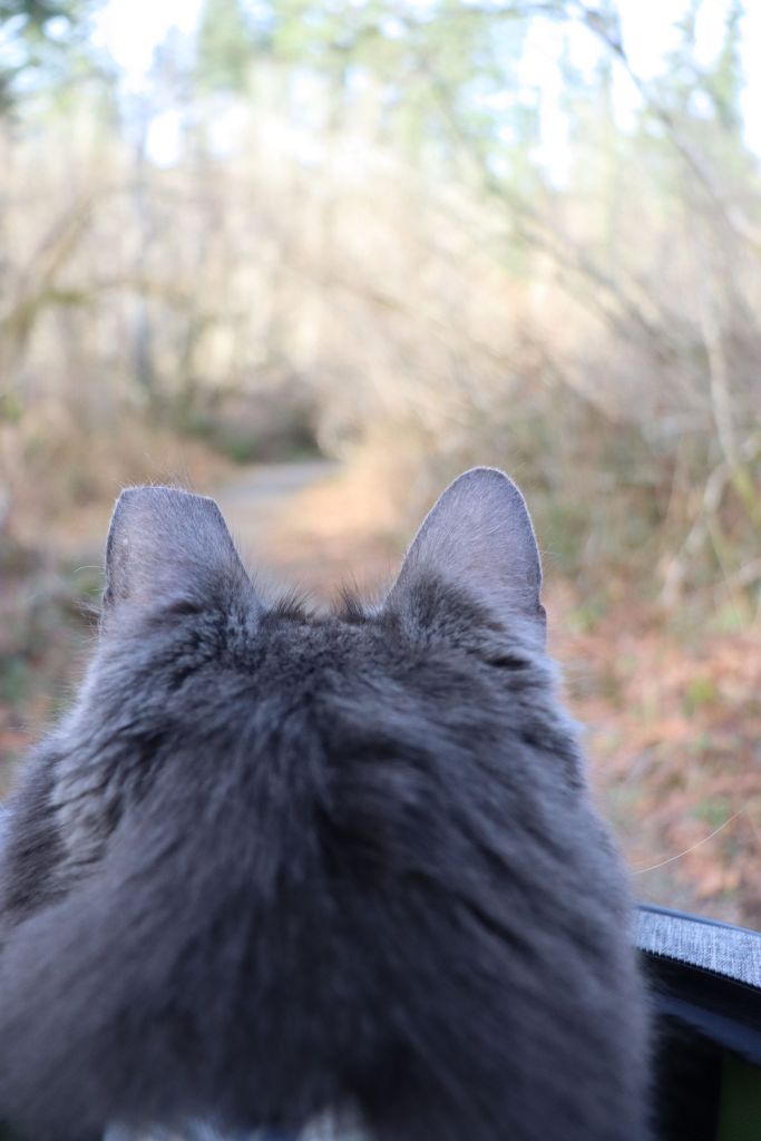 Near the end of our hike, we found a great big hollow tree. Sieh found a lair at its base and decided that he was now a forest cat, and that the hole was his home. I had to trick him with freeze-dried minnows to get him to come out!