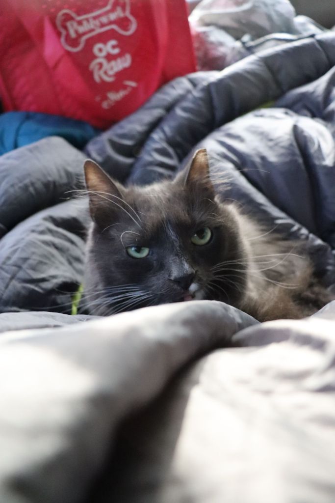 While I was getting us set up, an orange tabby trotted by our campsite. I called out to them, they stopped to look at me for a moment, and then they carried on about their business. They didn’t seem skittish, so I assumed they were supposed to be here, but I did check in with a volunteer to see if anyone had lost an orange cat. Nope! Kitty lives here, and there’s a black cat, as well!