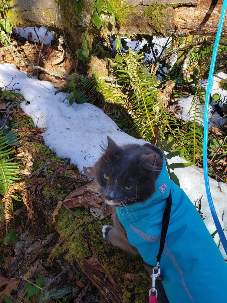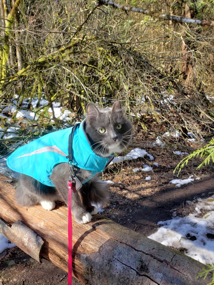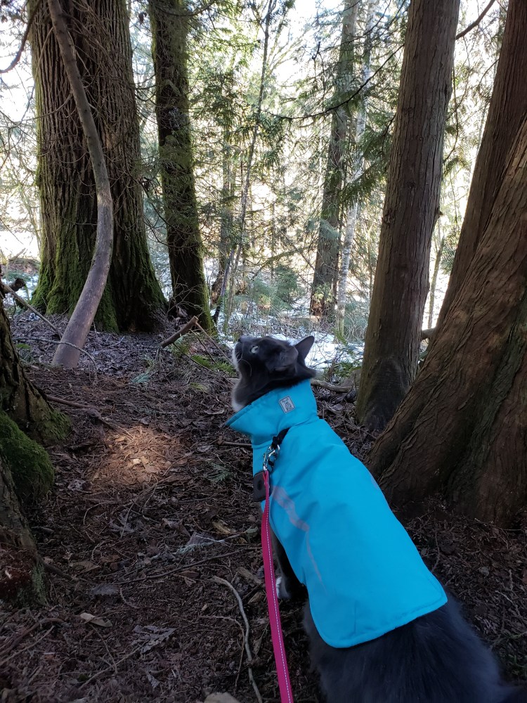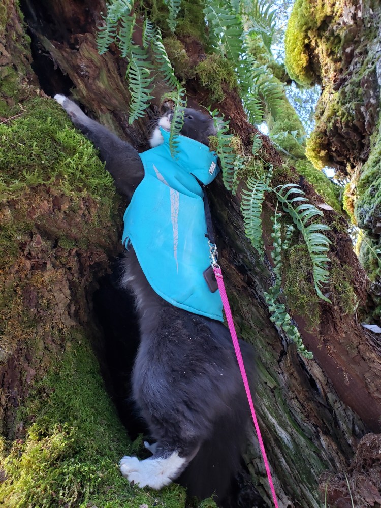 Leeloo begged to climb a tree that had a large part of its trunk split off (we normally don’t get snow like we had, so the trees really suffered). She was so happy, she couldn’t stop kneading the air!