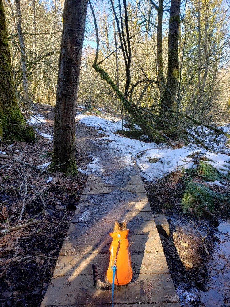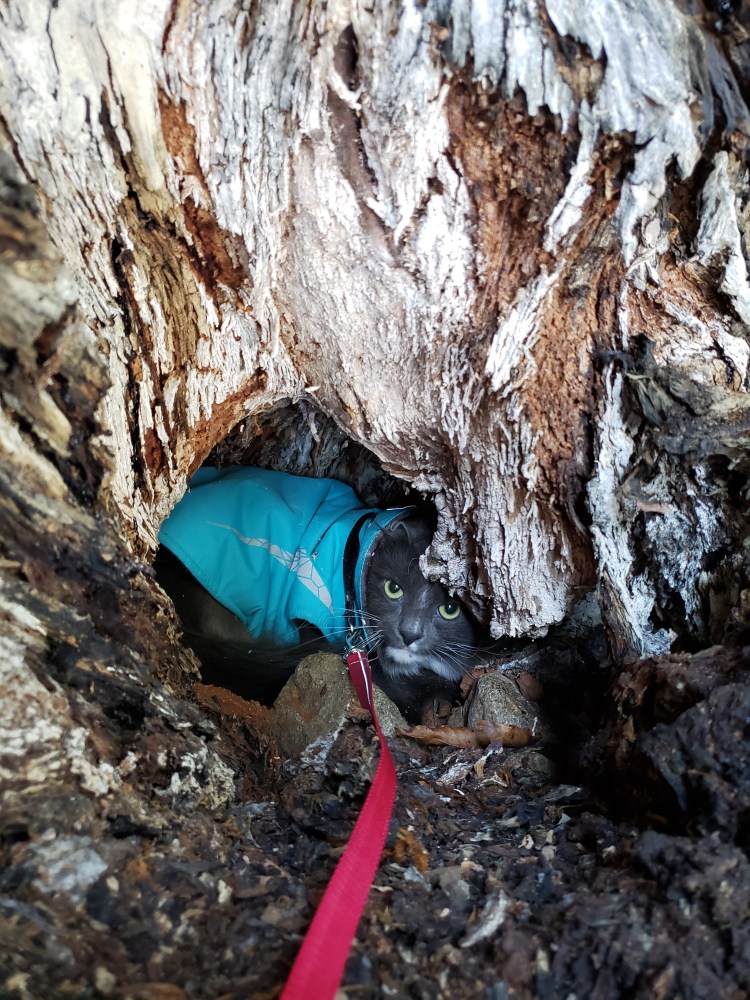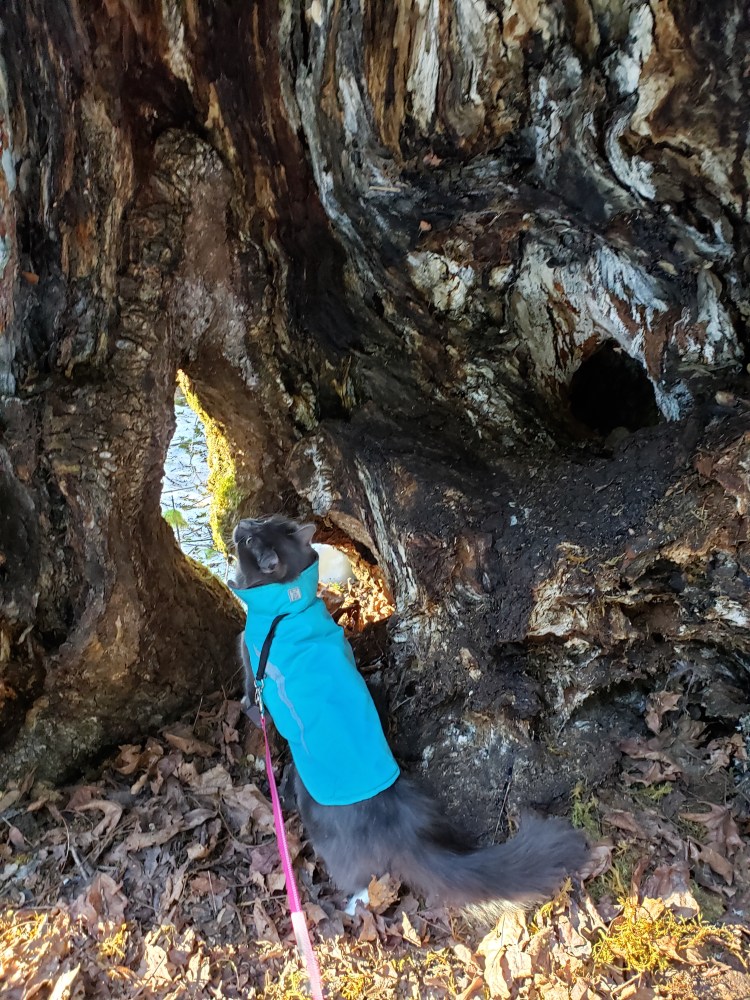 Near the end of our hike, we found a great big hollow tree. Sieh found a lair at its base and decided that he was now a forest cat, and that the hole was his home. I had to trick him with freeze-dried minnows to get him to come out!
