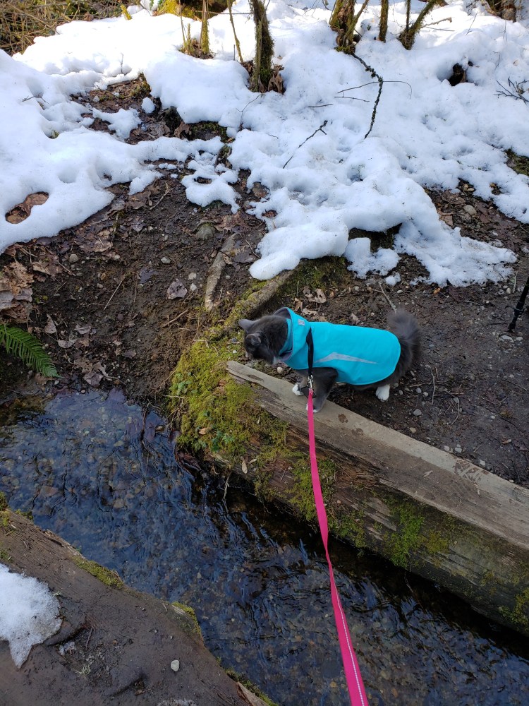 I didn’t manage to get a video of it, but after watching me pick my way carefully across a stream, Leeloo started to follow. She carefully chose all the same stones I had stepped on, until she got distracted, and then just stomped the rest of the way through the frigid water.