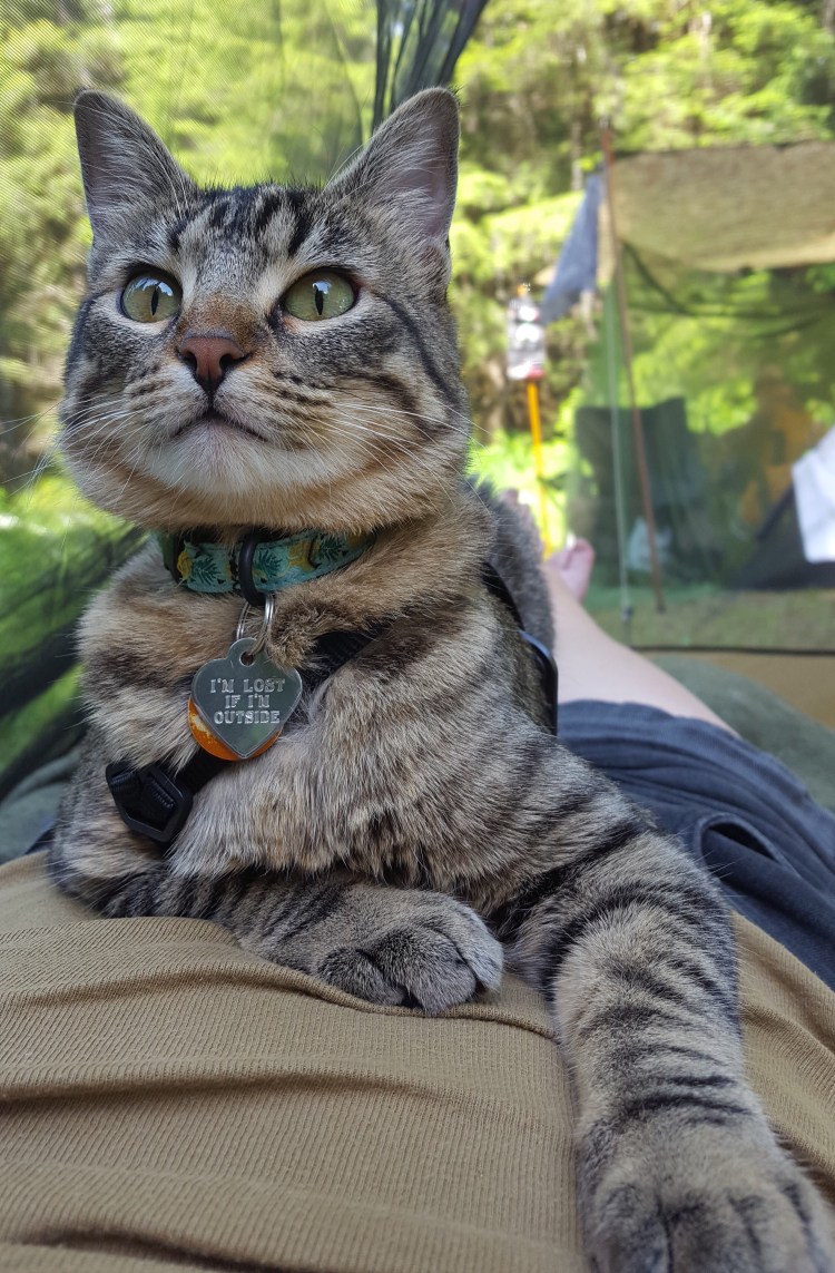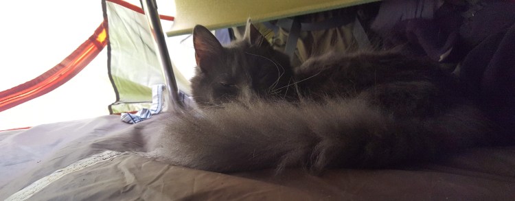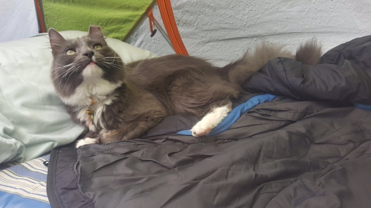 Still quite a bit of chill in the air, so I woke up and bundled the kids and myself up in warm sweaters, and then woke up a couple hours later to get Leeloo into a puffy coat on top of that. Lovely going to sleep to the sound of frogs and the stream. We even heard an owl! The kids did great their first night of camping, figured the litterbox out right away, and generally kept themselves amused.