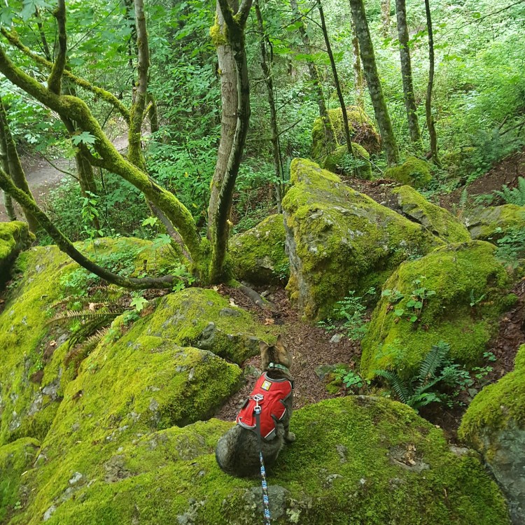 We started by walking around the campsite, and checking out the service road and bridge. Aside from some mosquitos, we weren’t bothered by much in the way of insects, so we really took our time poking around. It was so quiet, and both kids did great on their leashes. Leeloo even decided that we should try running!